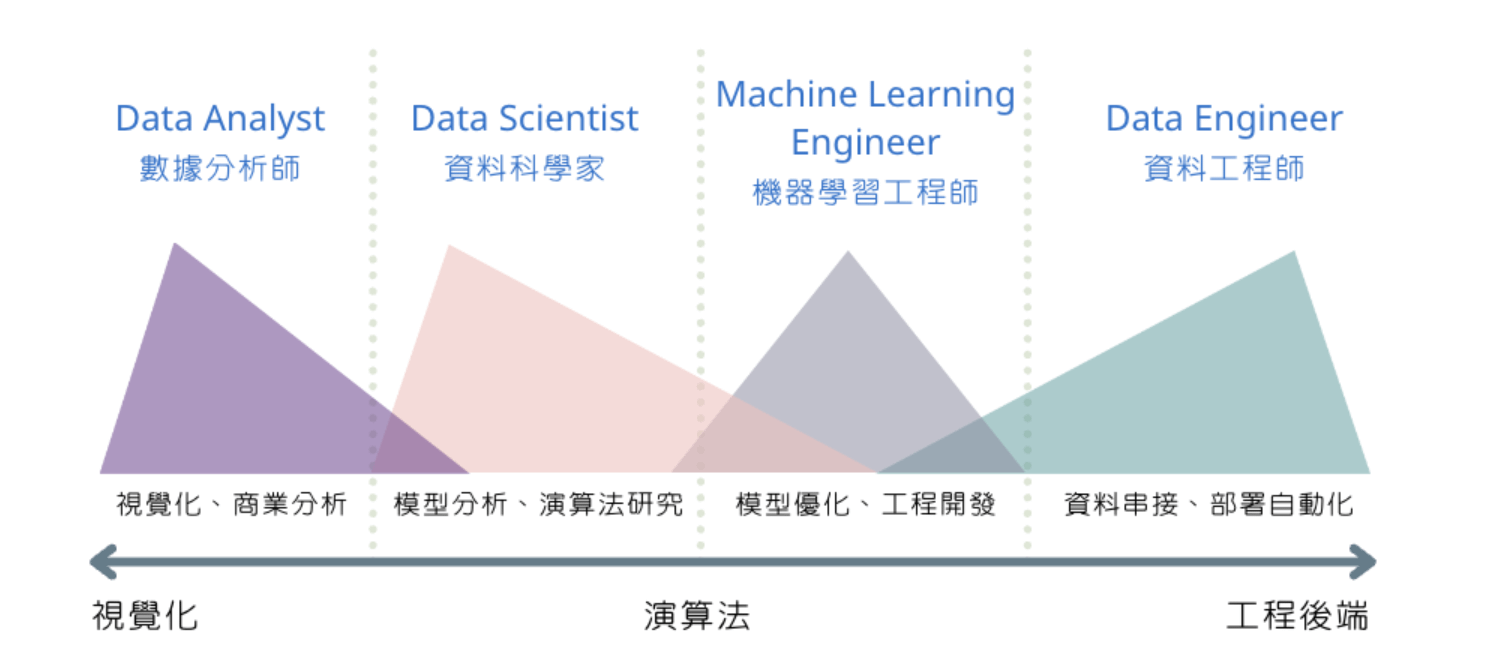 - 目標:因資料職能非常多元,包含 Data Analyst、Data Scientist、Machine Learning Engineer 、Data Engineer 等,我們需要確立自己要往哪個職能發展。